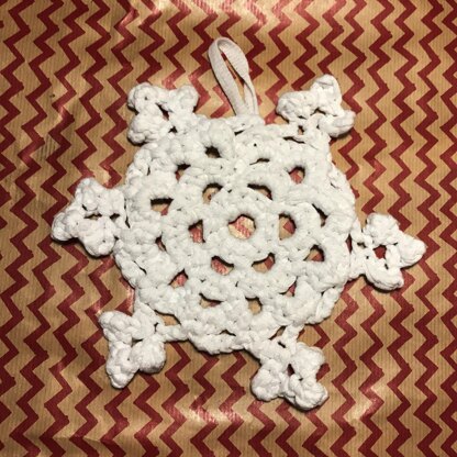 Using Paintbox Yarns new Recycled Ribbon, this snowflake can be used as a Christmas deocration for your tree, turned into bunting or used a pot holder on your dining table on the big day. Or all three!