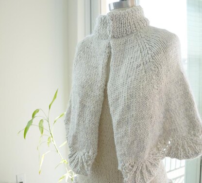 Knitted with washable alpaca blend and mohair yarn held together, this cape/shawl is knitted seamlessly, with pretty lace detail and a chunky collar.