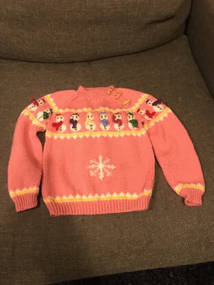 The Snowmen Jumper is designed with fun in mind! A happy band of snowmen wearing scarves at the raglan give it a festive wintery feel. It is knitted in parts and joined with seams and instructions range from approximately 1-9 years. The scarves are added at the end and are either knitted separately and sewn on, or embroidered on using chain stitch. There’s a button fastening on the raglan so no tight necks to contend with. I’ve listed quantities of Debbie Bliss Rialto DK as this is a beautiful pure merino yarn in an excellent range of colours but any good quality yarn of the same guage would work.
