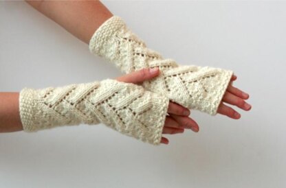 Highly textured, these thick wooly fingerless mittens boast a center panel of beautiful lacy branches, heavy with snow, flanked by a geometric dot pattern ~ the pattern combination resembling a snowy winter scape. A longer style mitt, hitting at mid- forearm, with edging in moss stitch, a further departure from traditionally styled gloves.