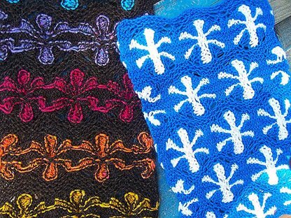Momeraths, or stars, or snowflakes, or bugs, or… I don't know what it is. Some thingies. Love the wrong side; it looks like flowers to me. This is a no-stranding garter stitch colorwork pattern; you work with just one color in every row. The scarf needs to blocked to lay completely flat. Because it can be knitted any size, I cannot specify yarn amounts. My special thanks to Olgagermany for checking it! I use stacked decreases/increases method. If you're interested in that technique, also check these out: Stream, Color Reef, and Lothlorien.