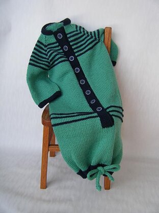Knit flat from the top down to the bottom of the button opening then joined to knit in the round to the hem. Sleeves are knit in the round to the cuffs. Button bands and flaps for the seat belt slot are picked up and knit after the body is finished. I-cord tie draws the bottom together to keep out the cold but can be opened for easy diaper changes.