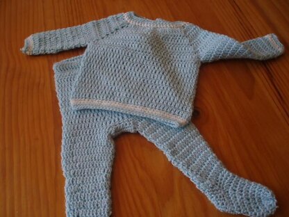 A warm baby pattern for footed leggings and matching sweater. The leggings have an enclosed elastic waistband and short rows to make the waist to crotch back, longer than the waist to front crotch.