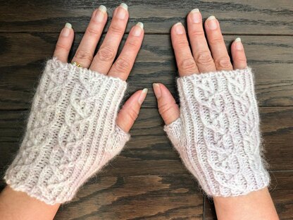 Yarn used for sample: 1 skein of Worsted weight yarn. Sample mitts size S/M used: Glenheaven Angora Merino 10 ply in the Snow Goose color-way, approximately 85 yds.