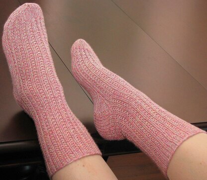 This pair is knit from the top down and has a simple rib pattern of only 2 rows. The pattern is written for double pointed needles, however, the instructions use stitch markers for direction so that your preferred needle method can be substituted easily. Wonderfully suited to both men and women, this very easy, very handsome pattern would look good in just about any yarn: solid, kettle dyed, subtly or wildly variegated-- it's just that basic and versatile.