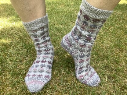 Socks are made up of geometrical shapes. The leg and foot are cylinders, the heel flap is a rectangle, the heel is a hemisphere, the gusset is a triangle, and the toe is a trapezoid! So to honour this discovery, I have designed this simple pattern. The circles are blurry owing to using a marled yarn on a solid background, but you can create a sharper effect if you use a solid yarn on a marled background. You could experiment with 2 solid colours - just be as creative as you want! The socks are knitted cuff down with heel flap. The heel, sole and toe are worked with 2 strands of yarn held together on alternate rows, so creating a lovely thick, comfortable sole to walk on with reduced chance of wearing through. Instructions are given in 3 sizes: slimmer foot woman/teenager; average foot woman/slim man; and broader foot/average man.