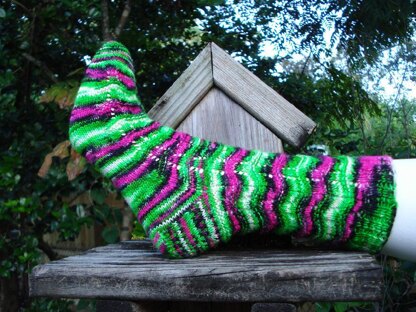 I held the socks up to my son for his approval. He said, “Cool! What are they called?” I told him I had no idea. He beamed. “They’re sockadelic!” And so the sockadelic socks were named. After that, what else could you call them? On these socks, a modified k2, p1 rib flows into the wavy chevron pattern that is strong enough to stand up against this wonderfully bright and crazy yarn. The purl ridges break up any pooling and stand out like little ruffles. Instructions are written for magic loop, but this can easily be worked on dpns as well.
