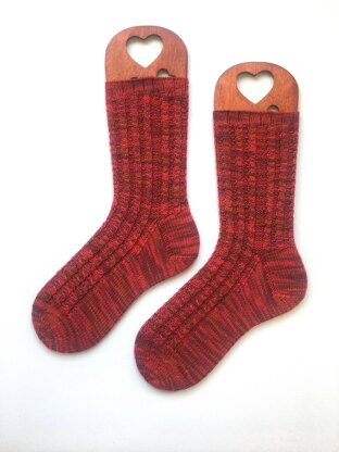 Handgestrickte Socken mit einem dekorativen Fantasiesockenmuster. Es schmückt den Schaft und die Fußoberseite.