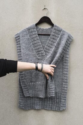 The Sofia slipover is a different length knit. It means that front is to the hips and back is below hips. Both vest sides are open but they can be sewn and you will have a closed slipover. It is worked in Stockinette stitch pattern. Front rib of the vest is narrowing to bottom however back rib is longer and worked straight. Neck and both sides are worked after knitting the main slipover piece. Sofia slipover is a simple and comfortable knit to wear on shirts or t-shirts.