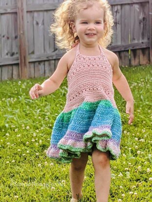 This super simple toddler dress is the cutest thing ever for your little princess! It’s made in two panels that you sew together, and the striping happens naturally from the yarn so you have very few ends to weave in. I used Lion Brand Coboo in Pink and Lion Brand Mandala Ombré in Balance but I think this dress would look cute in any colors you choose. You will need two different size hooks, though, because the yarn on the bodice is lighter than the yarn on the skirt. This is the first toddler dress I’ve ever made so I can’t be exact with sizing though it fits my granddaughter who wears a 2T. The dimensions are as follows: 8 1/2” wide at bodice, 10” wide at waist, 14” long