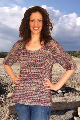This one piece, top-down, A-line sweater, with a round neck and elbow length sleeves, has tapered side gussets in reverse St st.