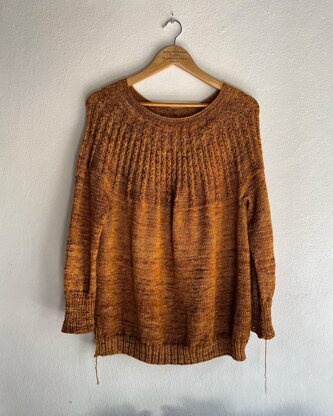 Solaris is a full-length sweater, with a round yoke inspired by the rays of the sun. This is an easy circular yoke, top-down sweater with a rolled neckline and mock-cables. Designed to be a little oversized with 1-4” of positive ease at the bust.