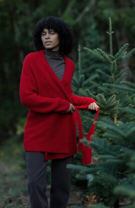 Top down seamless hybrid shoulder cardigan/robe. The back collar is worked first, then back stitches are picked up along the back collar edge, and worked flat to the underarm, with shoulder and underarm increases. Front stitches are picked up along the shoulder’s edge and collar live stitches, and worked flat to the underarm with collar worked simultaneously. After fronts are worked to the underarm, back and fronts will be joined and the body is worked flat to hem. Sleeves are picked up around each armhole and worked in the round to the cuff. Finally the belt and two belt straps are made.