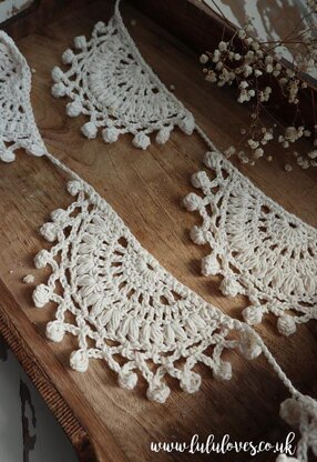 Bunting is made by making 8 individual flags first which are then joined to make a string of bunting. Using puff stitches and a pretty bobble edging.