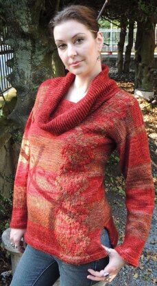 Sotto Voce is a cozy cowl necked pull over. A bold motif that alternates with stripes is suitable for many color combinations. A provisional cast on is used to create the hem, but a conventional cast on can be used and the hem can be sewn. Sizes 34 (38, 42, 46, 50) Finished measurements: 39 (43, 47, 51, 55)"