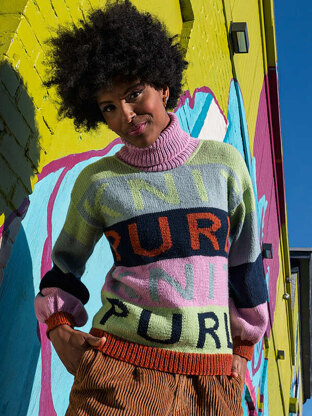 Punch up your wardrobe with a knit, purl combination! This graphic-style sweater will surely be the highlight of your closet with its audacious intarsia text. Knit from the bottom up in pieces, this pullover provides a perfect palette for your favorite shades.