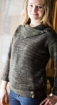 The Spare Time Pullover is just that, the perfect pullover for your Spare Time, knit in your spare time. It features hidden side pockets and a garter detail neck. It’s cozy and attractive, so you can feel comfortable, yet still look fabulous. It is knit from the bottom up, the bottom garter band is knit flat. Most of the body to the armhole is knit in the round, except for the pocket section. The top front and back are knit separately and seamed with 3 needle bind off. The sleeves sts are picked up from the armholes and knit. The garter collar is picked up and knit flat.