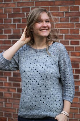 Sparkle Up is a loose fitting sweater with Dolman sleeves, worked from the bottom up. Starting with a bottom hem in twisted rib, the simple eyelet pattern is established and continued for the length of the body. When it’s time to prepare for the sleeves, increases are done on every round to acquire the number of stitches needed for 3/4 length sleeves. The work is then split for front and back, worked flat separately. The neckline depth on the front is acquired by working short rows. The shoulders and sleeves are grafted together using Kitchener stitch (a 3-needle bind off could also be used here), and the neckline is worked. To finish it all off, short cuffs are added on both sleeves.