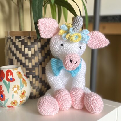 You'll also need very small amounts of blue, yellow and grey Dk yarn for the horn, bow tie and flowers. Unicorn measures 25cm tall when seated.