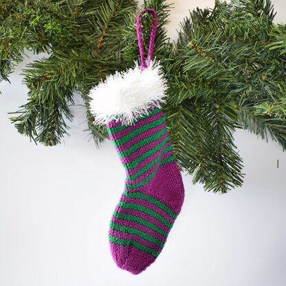This Christmas stocking decoration uses a fluffy tinsel eyelash yarn to add some sparkle to the top. The stocking is worked flat (knitted back and forth) on single pointed needles, not in the round, and uses short rows for shaping. The hanging loop is a single crochet chain worked on a crochet hook. Designed by Amanda Berry @fluffandfuzz, the stocking is knitted in DK weight yarns. For confident beginners and above, other techniques used include casting on and off, knits, purls, decreases, knitting stripes, short rows, and a little seaming to finish.