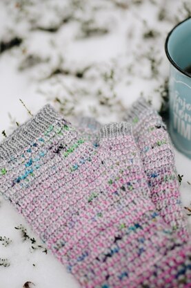 Tuck your hands into these toasty mitts for the ultimate in stylish warmth. Worked in a two-color brioche “tuck stitch”, they are stretchy and beautifully form fitting, while the speckled gradient contrast yarn fades to pale and practically shoots off sparks of electrifying color.