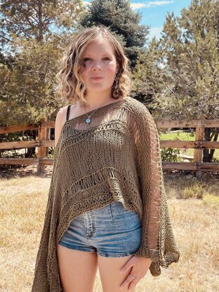 Sparrow is a light and airy top that is perfect for Spring and Summer Boho looks! Knit with worsted weight cotton yarn on larger needles, this top works up quickly. This pattern is written specifically for worsted weight yarn, but does include tips for changing the yarn weight. This top is written for One Size Fits Many, but I also include tips for making it wider and longer to adjust the fit for your body type. This is a simple pattern, suitable for an adventurous beginner, using only knits and purls with a few yarn overs thrown in. The top is knit in one piece with minimal finishing. SKILLS needed: Basic knitting knowledge, wrapping stitches/yarn overs, small amount of seaming, casting on and binding off. Approximate finished size: 60"w (wingspan) x 15"l (from neck to waist)