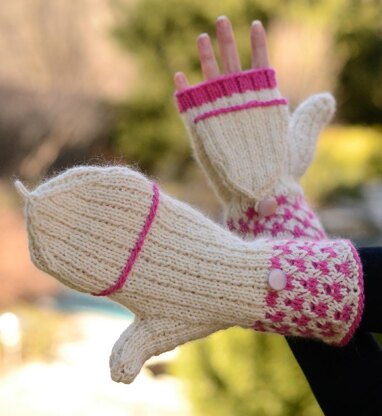 A ribbed, flip-top mitten with a simple color-work cuff.
