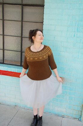 This is a pattern for a pullover worked from the top-down and knit in the round top with a 4 petaled Speedwell and leafy motif. Included are instructions to work with or without waist shaping and 3/4 length or long sleeves. Since it is worked from the top down, there is some room to customize your sweater.