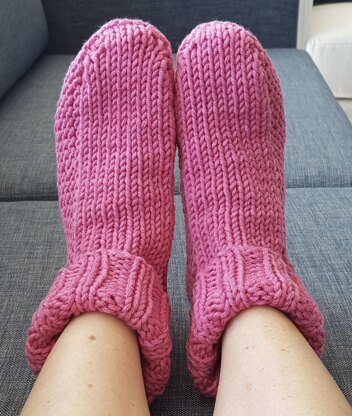 These chunky slipper-socks have a rib cuff then the foot is worked in stocking stitch, with a garter stitch sole. Warm, soft and so comfy to wear, you’ll never want to take them off!