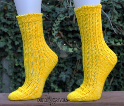 SPF 30 is worked from the top down starting with a picot cast on. The simple 2 row lace pattern is on the front and back of the leg and continues onto the heel flap. The heel is worked as a half handkerchief heel. The lace pattern continues on the instep and top of the foot while the sole is worked in stockinette.