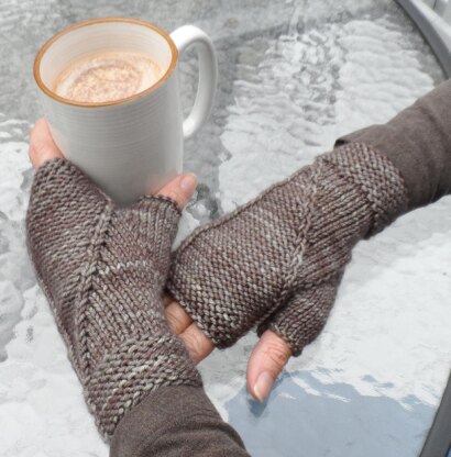 Stockinette and reverse stockinette separated by a slanting line of twisted stitches add texture and interest to these fingerless mitts.