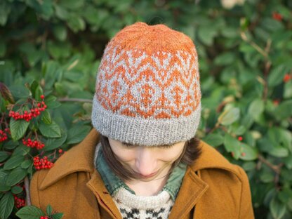 The Spinnan hat is worked in two colours, in the round from the bottom up, with an abstract stranded motif on the main body of the hat. The brim is worked in the main colour, and the crown is worked in the contrast colour. Options are given for a single or folded double brim.
