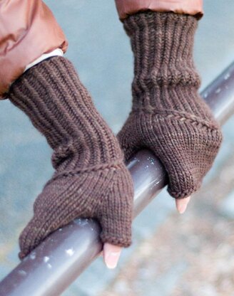 Long fingerless mitts with a twisted rib stitches that transition into stockinette stitch.