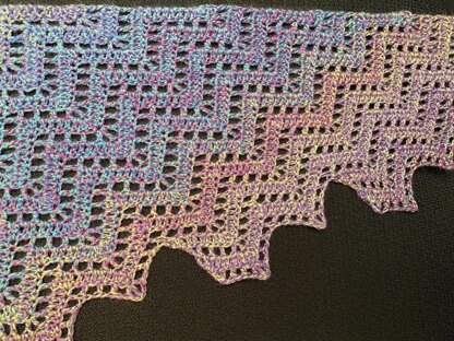The Spires Shawl features a lacy chevron pattern with jagged decreases along one edge reminiscent of the spires on a castle.
