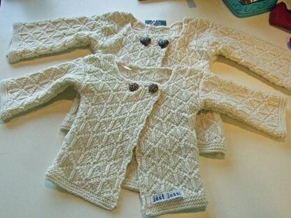 This sophisticated jacket is knitted in one piece to underarms, the aran motif gives a chunky look with less weight.