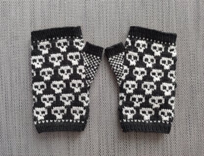 These spooky fairisle mitts (fingerless gloves) are worked in the round from cuff to palm and feature a repeating skull design. Super cosy and perfect for winter. A pair of mitts can be knitted with two 50g balls of 4-ply yarn (one of each colour), leaving plenty to spare for other projects, so they are affordable to make and make perfect gifts. Would look wonderful in a variety of colour combinations.