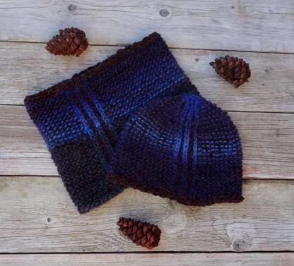 A unique super chunky hat and cowl set that features a two tone asymmetrical striped pattern, worked in round for a neat seamless and reversible look.