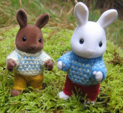 This is my own pattern for warm jumpers and trousers for your Sylvanian Families, Calico Critters and Forest Families figurines. The easy mosaic construction allows knitter to handle only one colour at a time, the second colour is left hanging until needed. The pattern is written in detail, with notes to help at critical moments. There is a pocket in the trousers to delight young owners; and the jumper becomes a jacket if turned back-to-front. Any fine laceweight or cobweb yarn will work, the slight differences in the finished size of the garment will surely fit one of the many different sizes of figurines! You need 1.5mm (old UK size 17) needles; and three little buttons are needed for each outfit. Happy knitting! Thank you for looking!