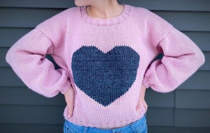 What a perfect way to spread the message of love! This sweater is knit in one color and the heart pattern is embroidered on using the duplicate stitch. I enjoyed this method for the extra thickness and dimension of the heart. It would be really fun with a textured or eyelash yarn or multiple colors or variegated yarn.