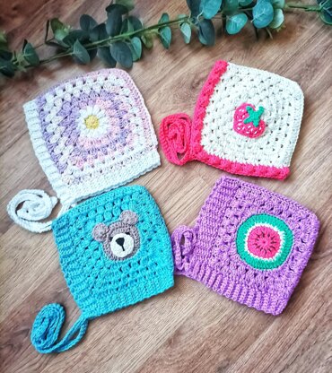 This cute collection of bonnets are all made with two granny squares then slip stitched together to form a bonnet, then crochet a ribbed edging and ties.