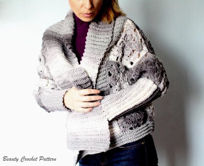 The cardigan has lace back part, big textured collar and cuffs. Spring Cardigan Pattern includes two women sizes: S/M and L/XL