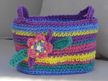 This basket, in all variations, is really fun to make! It's made in Red Heart Super Saver which is perfect for baskets. Stripes make it a good stash buster project and the pattern works with almost any worsted weight yarn, but avoid very soft yarns or the basket might not keep its shape. The pattern has detailed instructions in the format of a photo tutorial for each step. Although it is listed as intermediate skill, an experienced beginner would find it helpful to learn new techniques and should do fine. The pattern includes instructions and photos for the basket pictured in the top large photo as well as for the alternate stripe pattern shown, alternate handle instructions, and 3 ways to make the optional flower applique. This versatile and fun pattern gives you lots of choices and is really multiple patterns in one! It's perfect for an Easter basket, or a gift basket, as well as a container for a plant, and many other uses.