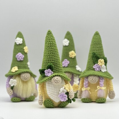 This pattern guides you step by step through creating four cute and seasonal spring gnomes, each featuring charming floral details and soft textures. With two beard/hair options included, you can customize each gnome to create a unique spring display.
