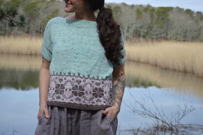 Spring Hopes is a spring inspired knit tee. The design is worked from the bottom up in the round and features a floral color work edging. The tee has a boxy fit with a drop shoulder, ribbed boat neckline, and short sleeves. Knit up in Into the Whirled Pakokku yarn, its the perfect light-weight top to wear in the warmer spring and Sumer months!