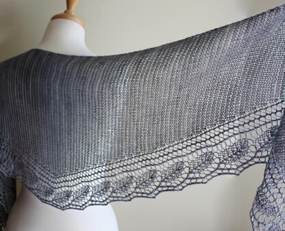 This cute little shawl is light and delicate like a gentle spring rain. The pretty leaf and eyelet edging is a perfect complement to the garter stitch body. Worked in one piece, from one tip to the other, this shawl is easy enough to make the knitting go quickly but intricate enough to keep it interesting. The lace border is worked at the same time as the body of the shawl. Size is adjustable, based on how much yarn is used. This pattern is designed in RainCityKnits Super Sock, but one skein of any sock or fingering weight yarn is suitable. Pattern includes notes, list of abbreviations, diagram, and written as well as charted instructions. Skills required: increasing, decreasing, knitting lace, blocking lace. Stitches used: k, p, sl pwise wyif, k2tog, kfb, p2tog, SK2P, ssk, yo.