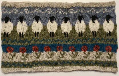 When it’s spring I think of sheep so I decided to design a snood to celebrate the change of season. The snood is knitted in the round. There are four charts to follow making it easy to do the colour work. Part balls of each colour are used.