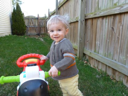 The perfect layering sweater for chilly days when kids need to put on a little "something extra" for outdoor play. Knit top down with lots of texture, and bright stripes for color. The asymetrical yoke opening allows plenty of room for easy over-the-head on and off for babies and toddlers. The construction of the pullover starts out as flat knitting, and becomes in-the-round knitting below the arms. Sleeve sections are put on waste yarn, and then finished at the end. Instructions are in written format.