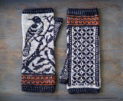 A tribute to hope and change, these stranded mitts feature a pair of orioles perching in leafy branches. In parts of the United States, orioles are considered to be harbingers of spring; they represent a sure sign that the bleakness of winter has given way to warmth and new life. The wide figurative panel on the back of each mitt wraps around to meet a narrower patterned panel along the palm side of the mitt. This pattern is recommended for knitters who have experience with stranded color work, reading from charts, and knitting in the round.
