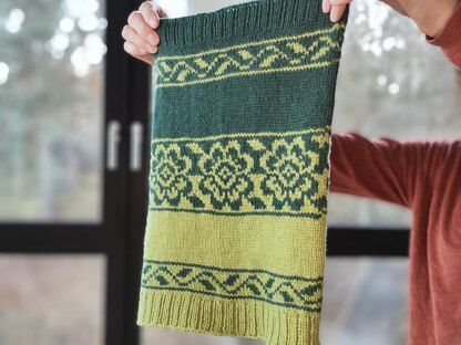 The Springtime Cowl is knitted seamlessly in the round from one opening to the other with a two-colored pattern. It starts with the color A (CA) and 2x1 ribbing, followed by the two-colored and plain sections that change to color B (CB) in the middle of the cowl and mirror the pattern. The shown cowl is knitted in size A.