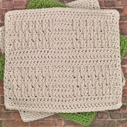 Four simple squares cross paths creating an elegant crochet square perfect for a blanket, afghan or pillow cover. The squares are created with front post treble crochet stitches.